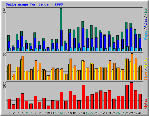 | Day | Hits | Files | Pages | Visits | Sites | KBytes | ||||||