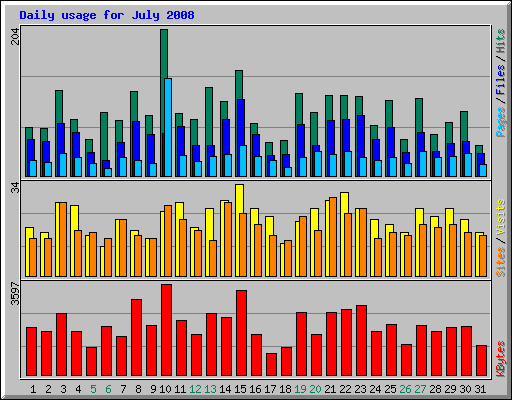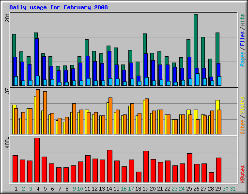 | Day | Hits | Files | Pages | Visits | Sites | KBytes | ||||||