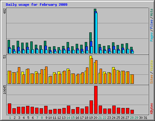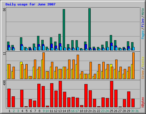 | Day | Hits | Files | Pages | Visits | Sites | KBytes | ||||||